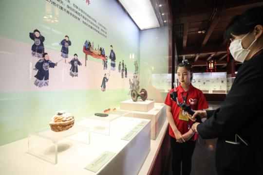 在沈阳故宫博物馆“古趣童心——清宫文物中的儿童世界”展览中,小志愿者通过直播向观众讲解。新华社供图