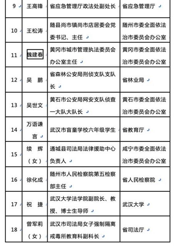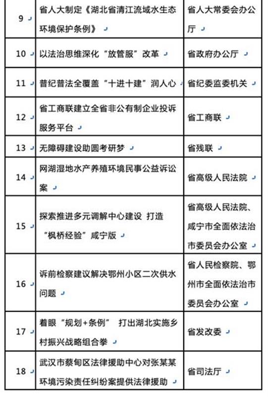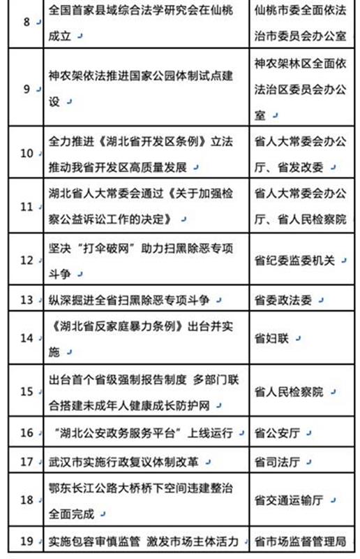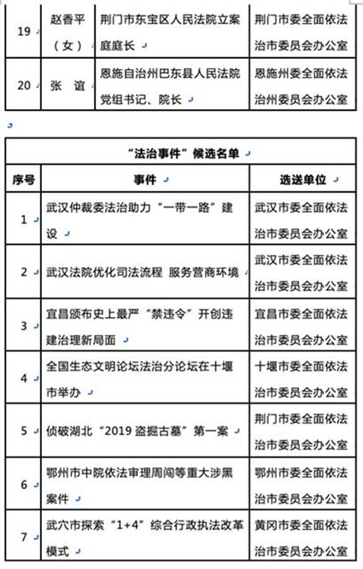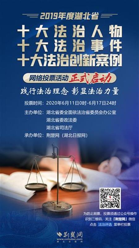 湖北日报讯(通讯员王相生)6月11日,由湖北省委全面依法治省委员会办公室、湖北省委政法委、湖北省司法厅主办,荆楚网(湖北日报网)承办的2019年度“湖北省十大法治人物 十大法治事件 十大法治创新案例”评选活动候选名单公布,公众网络投票活动同时启动。