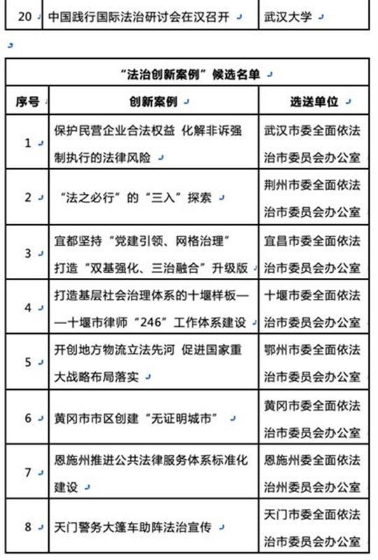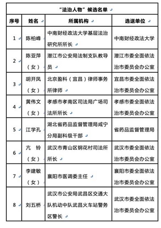 经专家初审,评审委员会已选出法治人物、法治事件、法治创新案例各20个候选对象。通过网络投票、评审委员会评审、公示通报等程序,将最终确定“湖北省十大法治人物、十大法治事件、十大法治创新案例”和30名(件)提名奖。