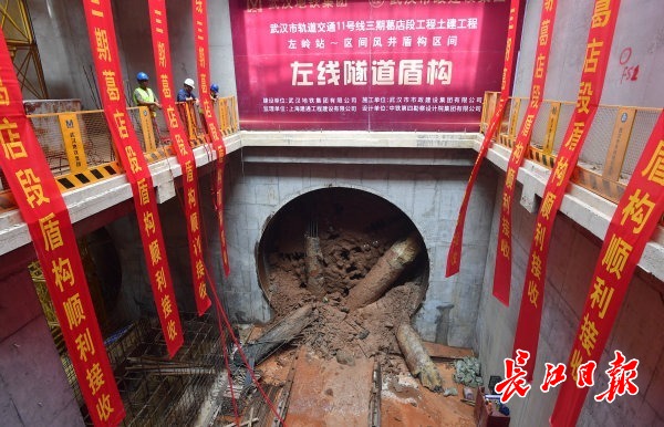 地铁11号线三期葛店段首段隧道贯通。图为盾构机正在破洞而出。记者李永刚 摄
