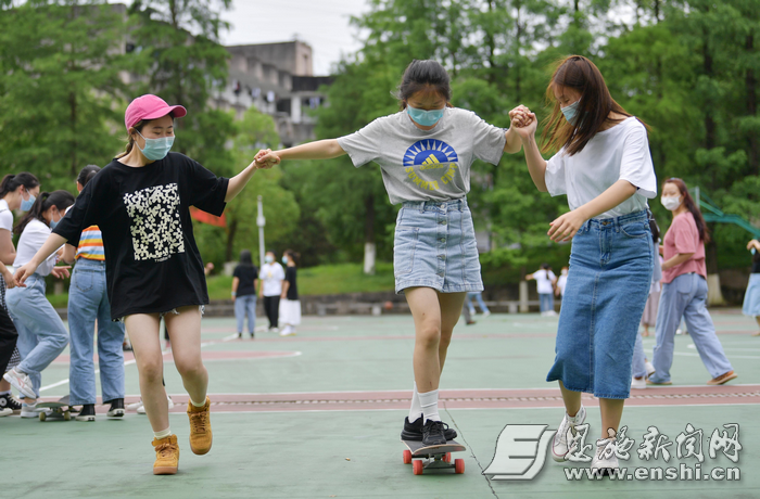 6月10日,恩施职业技术学院参加技能高考的学生正在玩滑板。