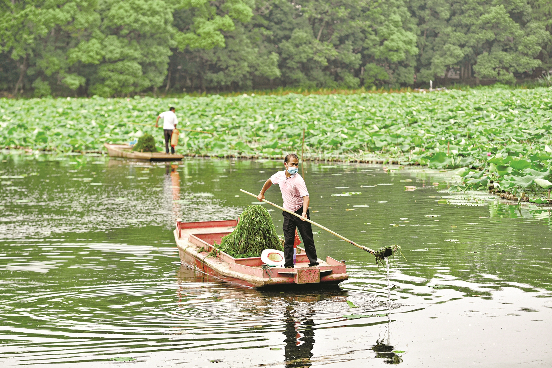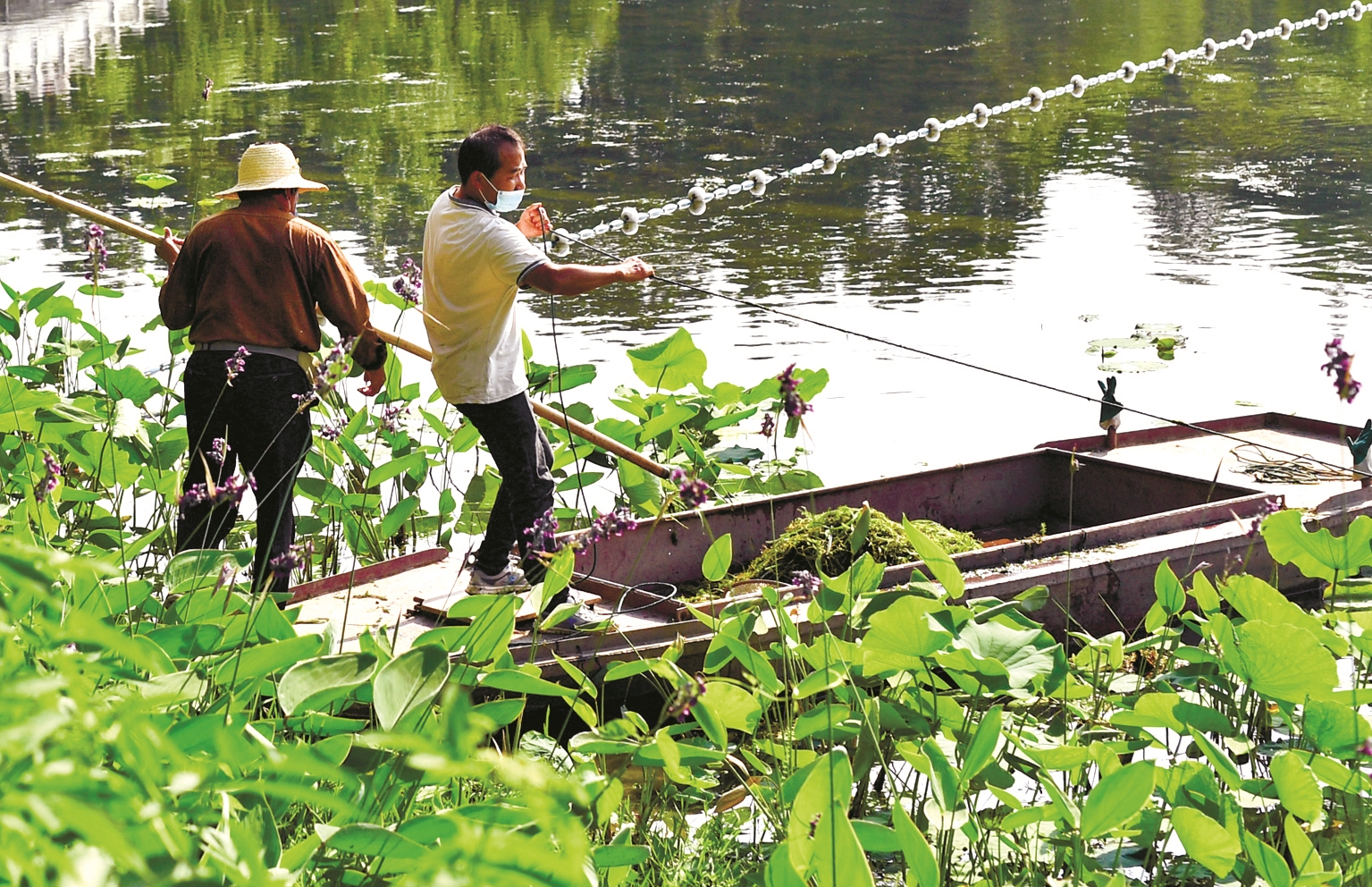 蔡志林(左)和同伴在湖面上清理水草