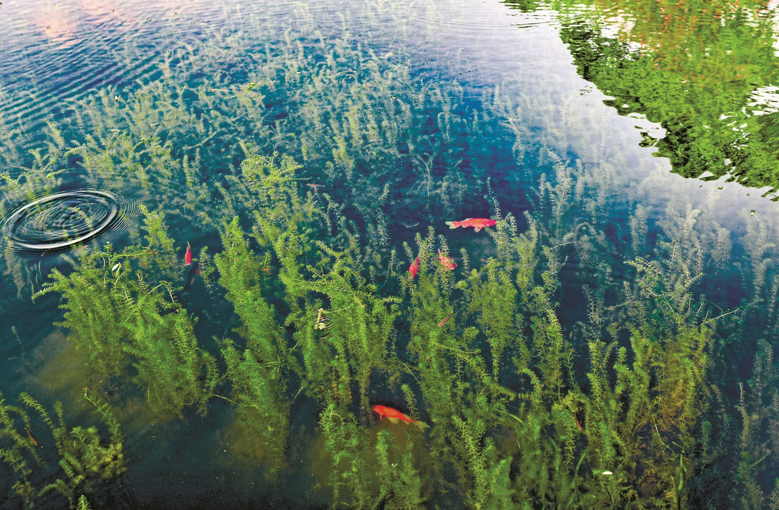 “理发师”巧手清理后,湖水清澈,鱼儿在丰茂的水草中游弋