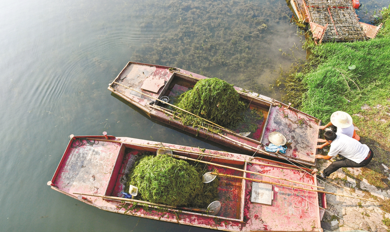 结束工作,蔡志林和同伴将装满水草的船系在岸边