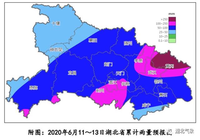武汉中心气象台预计今晚至13日,湖北省雨势明显增强,将出现入梅以来首场区域性暴雨过程,鄂西南、江汉平原至鄂东北一线大到暴雨、局部大暴雨,强降雨中心位于恩施、宜昌、荆州、 随州、孝感、武汉、黄冈、鄂州、天门、潜江、仙桃等地。上述地区累计雨量一般80-150毫米、局部地区可达200-300毫米,最大小时雨强40-80毫米,其他地区中到大雨、局部暴雨;过程期间伴有短时强降水、雷雨大风等强对流天气。