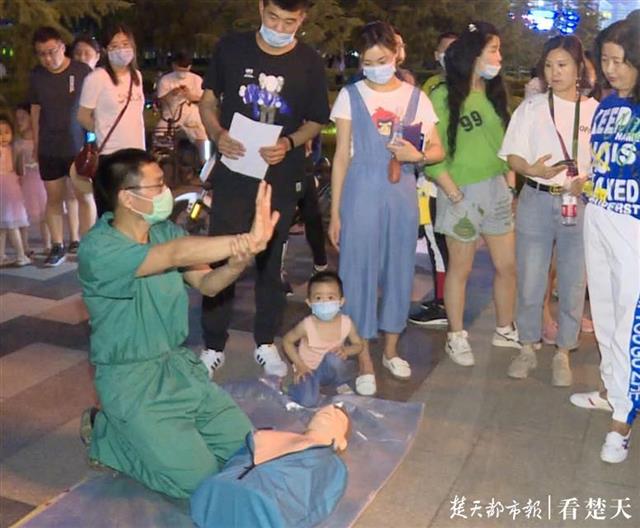视频中,一个“摊位”上摆放的是一个模拟人教具,一位穿着绿色隔离衣的医生向大家讲解心肺复苏术的重要性,跪在模拟人前,演示起了心肺复苏的流程。“先生、先生,怎么了?怎么了?这位先生昏迷,请帮忙拨打一下120。”说着,张军桥立即侧趴在模拟人的心脏部位,有节奏地念着“1201、1202、1203……1208,心脏呼吸停止,马上进行胸按压……”演示完流程,他又开始讲解急救要点,围观市民认真地听讲并学做按压手势。