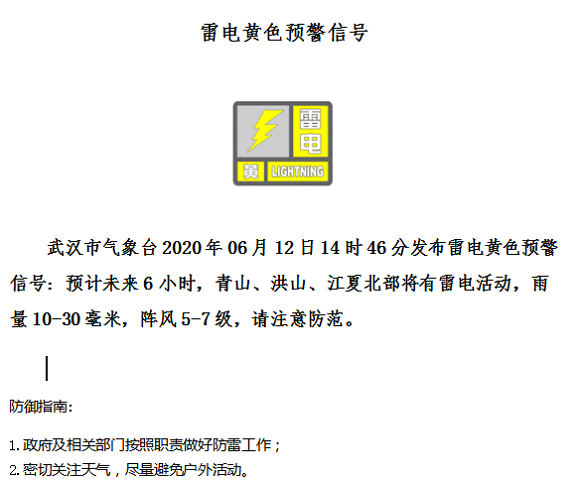 长江网6月12日讯(见习记者范佳昕)6月12日14时32分至14时46分,15分钟内,武汉市气象台连续发布2个雷电黄色预警信号:预计未来6小时,汉阳、硚口、江汉、江岸、武昌、青山、洪山、江夏北部将有雷电活动,雨量10-30毫米,阵风5-7级,请注意防范。