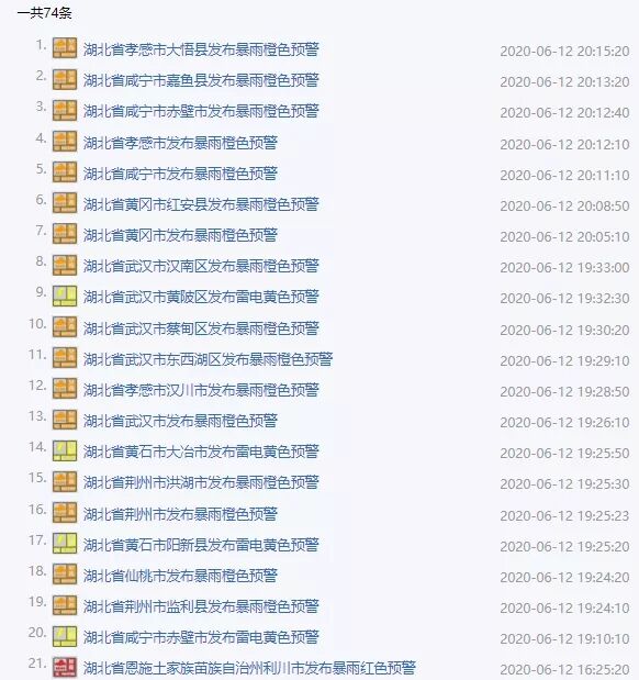 截至今晚20:00,湖北已发布74条气象预警信息!其中,湖北省武汉、襄阳、宜昌、十堰、孝感、荆州、恩施等地发布暴雨、雷电预警。