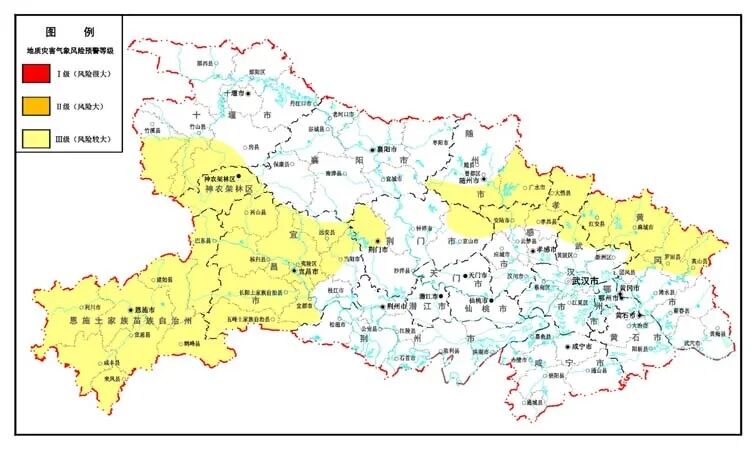 2020年6月12日20时-6月13日20时,预计三峡库区,神农架林区、恩施地区、宜昌地区,十堰(竹溪中部和南部、竹山南部、房县南部)、荆门(荆门市城区、京山北部)、随州(曾都区、随县南部、广水)、孝感(安陆、大悟、孝昌)、武汉(黄陂北部、新洲东北部)、黄冈(红安、麻城、罗田、英山、团风)以及其他暴雨中心发生崩塌、滑坡、泥石流的风险较大(Ⅲ级),请相关地方政府及有关部门做好地质灾害防范工作。