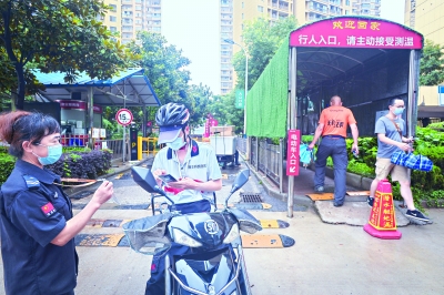 暴雨初歇,汉阳区龙阳街芳草社区汉荣苑小区西门,陆续有行人、车辆进出小区。记者看到,小区人行通道设置有自动测温门,居民只需扫码即可快速进出,而骑电动自行车的居民仍需人工测温。芳草社区副主任李丽霞介绍,该小区后期会逐步开放其他进出通道,同时为每个通道配备防控值守人员。