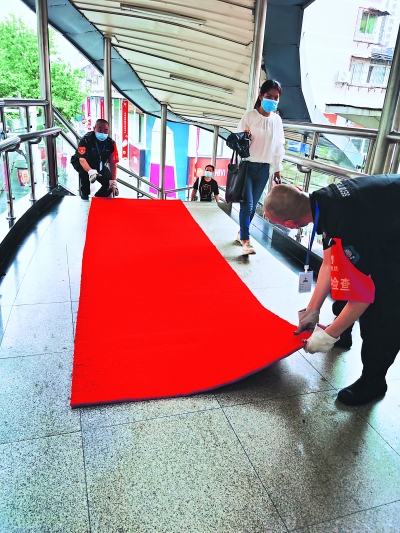13日上午,1号线循礼门站,应对暴雨工作人员正在铺设防滑地毯。长江日报记者郭佳 摄