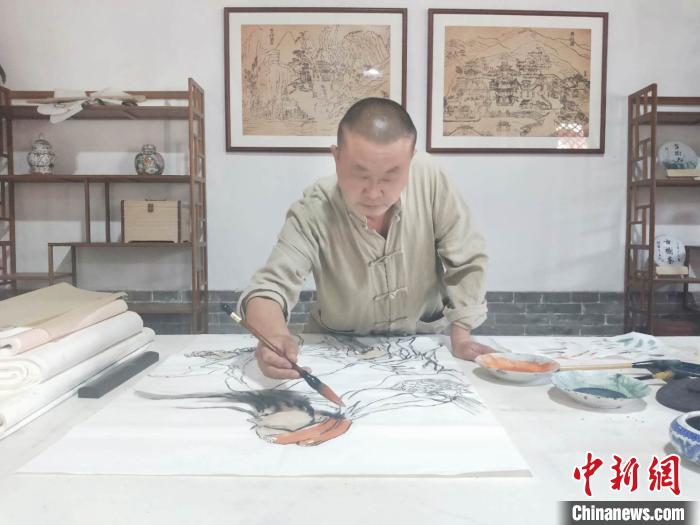 肖像画家王川邻只要有时间便在大关帝庙中创作关公肖像。 杨佩佩 摄