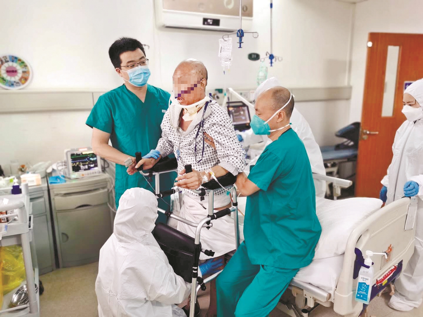 崔志强在医护人员协助下能站立了