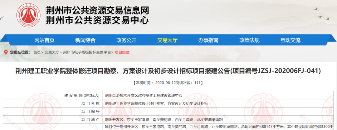 6月12日,荆州市公共资源交易信息网公布了《荆州理工职业学院整体搬迁项目勘察、方案设计及初步设计招标项目报建公告》。