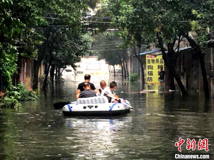 辖区道路渍水,襄阳市七里桥社区利用橡皮艇接送居民出行 姚莹 摄
