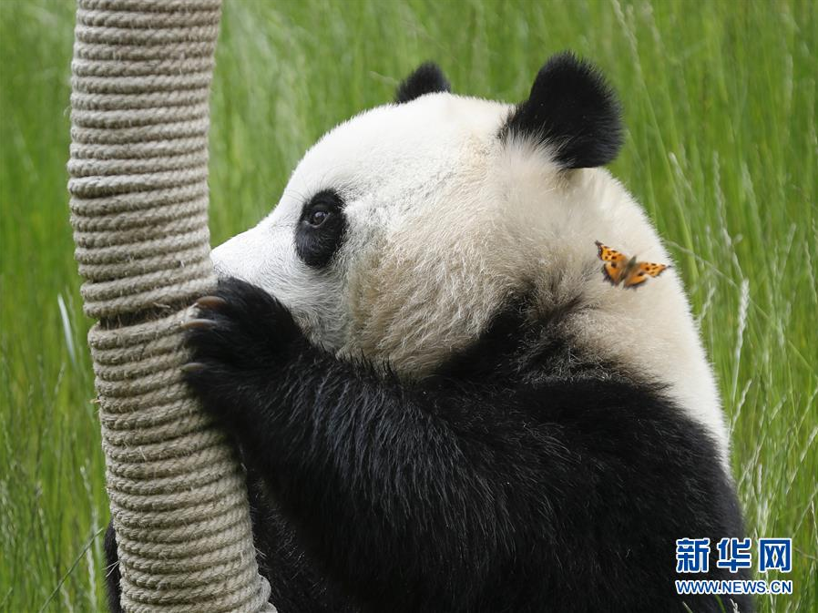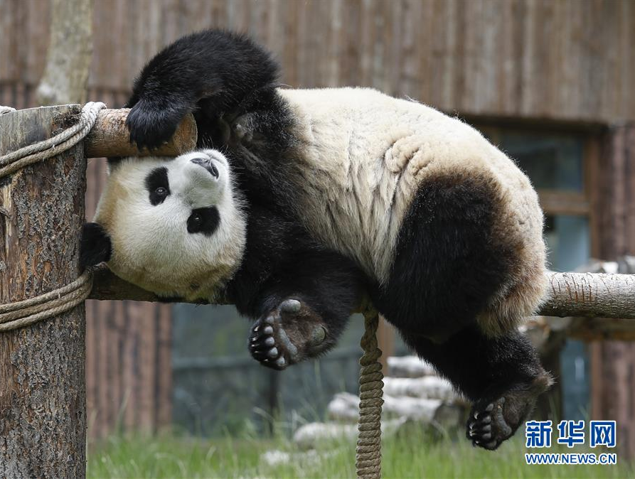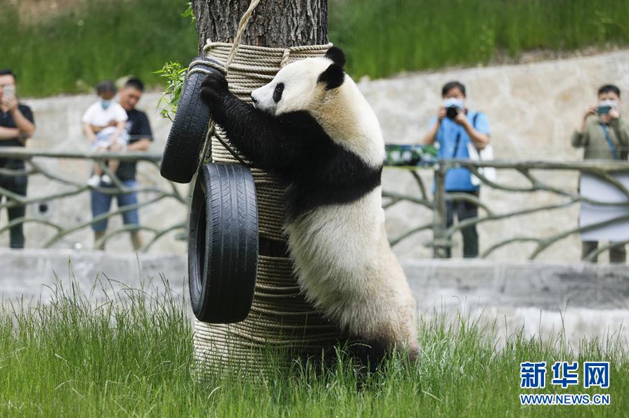 在位于四川省阿坝藏族羌族自治州的九寨沟大熊猫园,大熊猫“新新”在玩耍(6月19日摄)。 新华社记者 沈伯韩 摄