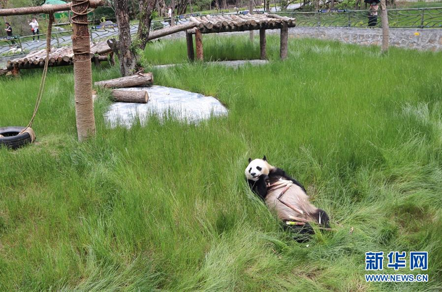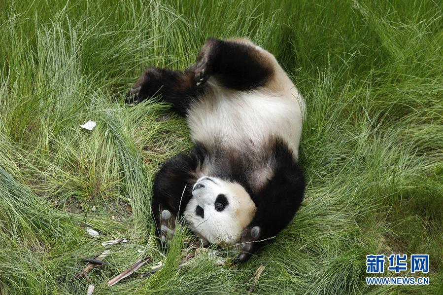 在位于四川省阿坝藏族羌族自治州的九寨沟大熊猫园,大熊猫“海海”在打滚(6月19日摄)。 新华社记者 沈伯韩 摄