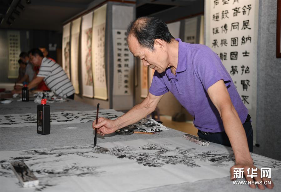 村民在水藤村红基石党群服务中心翰墨坊创作山水画(6月13日摄)。孩子们在练习咏春拳术和绘画书法,戏曲爱好者在排练粤剧,运动爱好者在乒乓球桌上比拼较量……这是记者在广东佛山市顺德区乐从镇水藤村红基石党群服务中心见到的一幕。 为丰富村民文化生活,2018年,水藤村投资建设的红基石党群服务中心投入使用,设书舍、翰墨坊、童趣坊、学膳坊、粤韵坊等,成为当地村民学习和休闲的好去处。新华社记者 邓华 摄