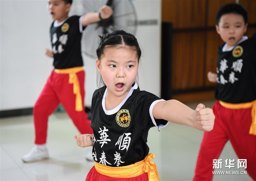小朋友在水藤村红基石党群服务中心练习咏春拳(6月13日摄)。新华社记者 邓华 摄