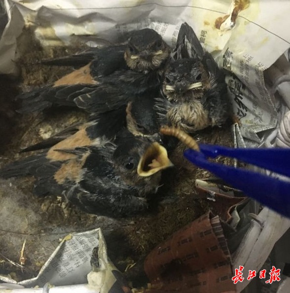 5月27日,绿化队接到市民的报警电话,称家里有个燕子窝掉下来了,有一窝小燕子需要救助。负责野生动物救助的队员伍雷把4只刚孵化没几天、眼睛都还没睁开的小燕子接回来,大家犯了难。
