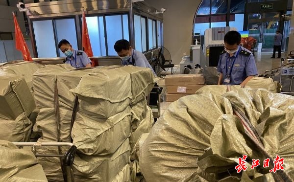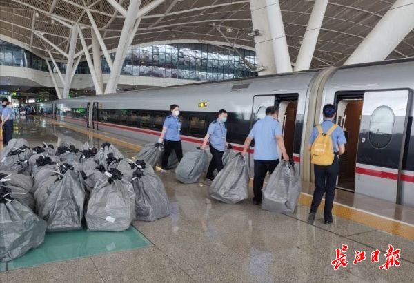 6月18日,武汉站和中铁快运武汉分公司等单位密切配合共同开启“高铁极速达”绿色通道,组织安检公司派专人协助中铁快运在站内快速安检、确保货物安全,每趟车安排专人在站台盯控转运、装车各环节,防止货物污染和途中破损,全力做好“高铁带货”的运输服务,确保了趟趟快速装运、安全正点。