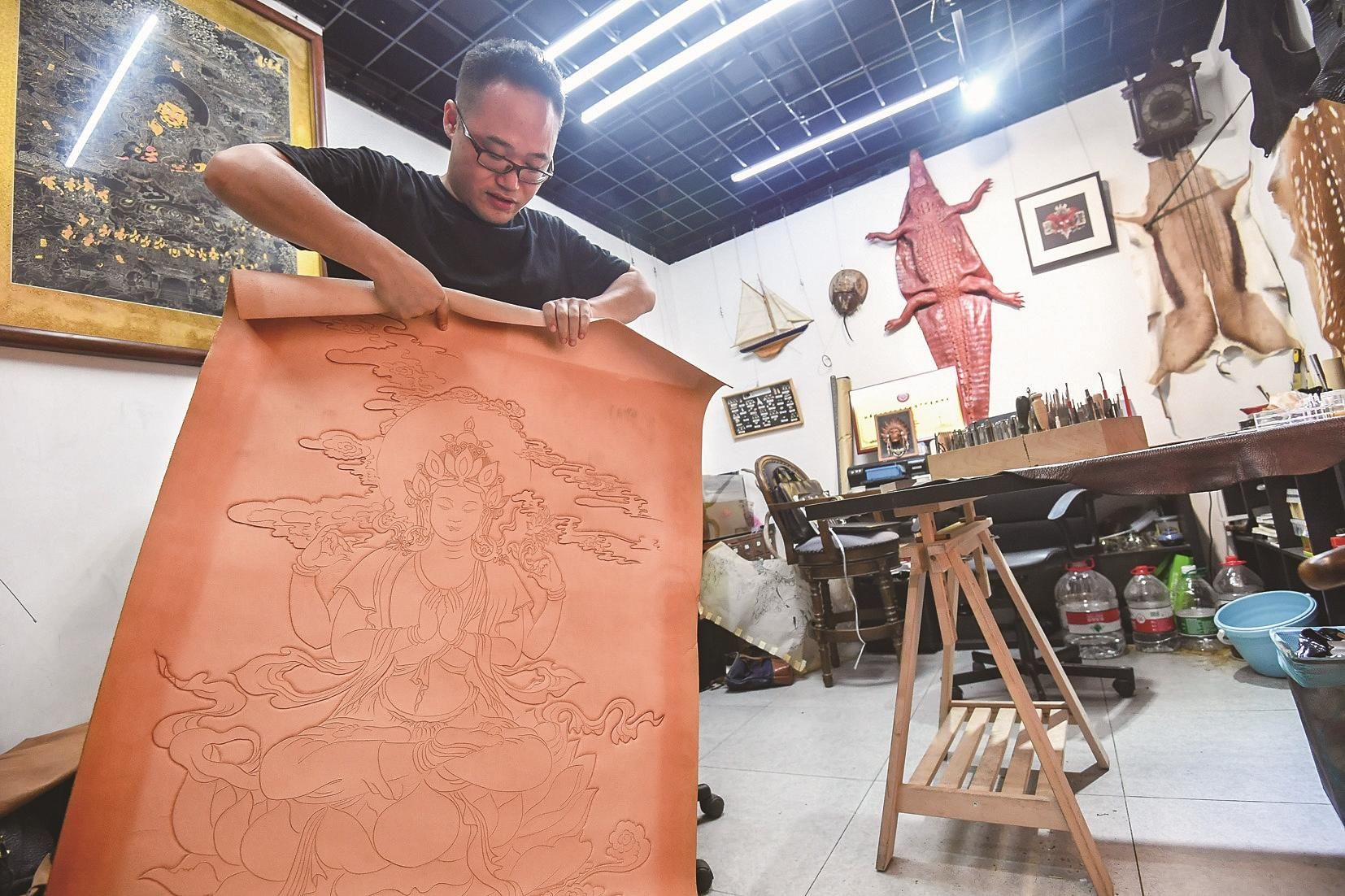 如今,在武昌区中北路海山文化艺术城,吴琨有自己的工作室。干净整洁的工作台上,各种细小的雕花刻刀簇拥在工具盒内,与屋内墙上、地上横七竖八的皮料,形成一种反差。