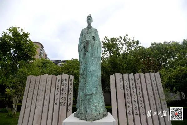 《先秦诗人》圆雕位于长江第一观景平台右侧平台植物园内,游园行人步道旁。圆雕使用青铜铸造工艺,表面青铜绿自然氧化成色。雕塑背后两侧分别矗立竹简造型石牌,石牌表面雕刻三首诗词节选书法。该圆雕为“直线式” 半抽象雕塑,雄伟壮丽,人物气宇轩昂,与山体浑然一体,表现先秦诗人傲骨嶙峋的写意形象。寓意长江诗歌开端、傲然于世岿然不动,展现了先秦诗性的人物风采。