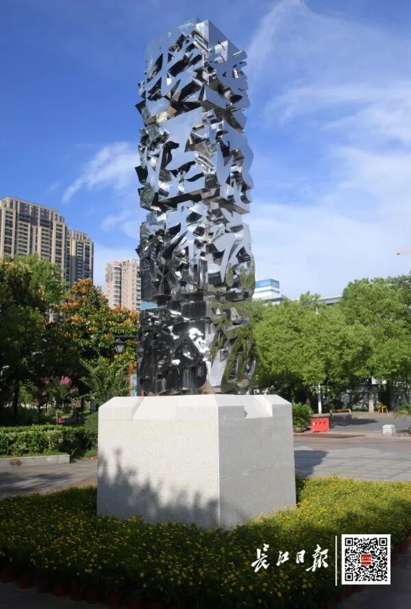 《长江诗廊》立式碑是武昌江滩长江诗廊收尾处的艺术品,由不锈钢锻造主体和花岗岩基座两部分组成。主体使用不锈钢铸造镜面抛光工艺,高大方正,光鲜剔透,现代感十足,四面以四种书法字体自上而下分别铸造“长江诗廊”四个大字。此处立式碑与《长江诗廊》卧式碑相呼应,两个铭文碑体,两种材质和形式,一个传统质朴,一个现代光丽,寓意滚滚长江水,从古看到今。