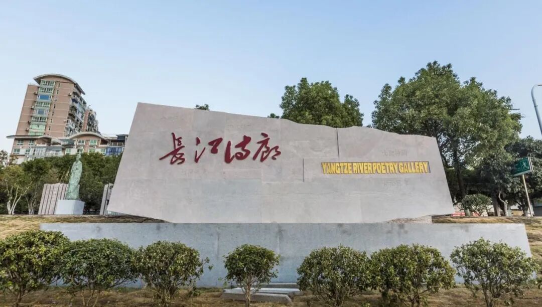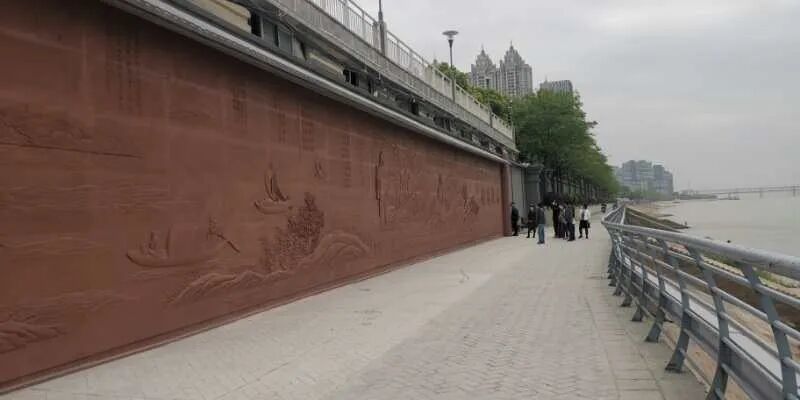 《长江诗廊》卧式碑位于长江第一观景平台右侧堤岸坡道上,是长江诗廊第一号位的艺术品。碑体采用高级花岗石整石安装,碑体表面雕刻文字与图案,阴刻与阳刻手法穿插结合。咫尺之外是水天—色的长江美景,正对长江左岸的高楼林立,独特地势让其成为右岸文化景观的点睛之笔。