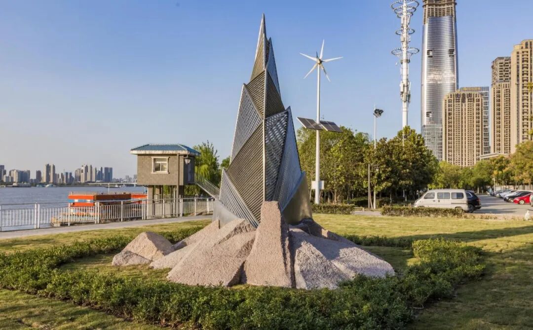 《破·立》雕塑位于月亮湾码头电厂闸口长江诗词廊结尾处草坪内,游园行人步道旁边。《破·立》寓意“破土而出,自立强国”,由上下两部分组成。上部分高5米,为不锈钢锻造,取材幼笋造型,新生柔弱;下部分高约1.3米,为花岗岩雕刻,象征凌厉危险的环境,表面雕刻现代诗词节选书法。《破·立》 形式一虚一实,纵横有度,质感分明,极具视觉张力和艺术表现力。
