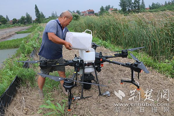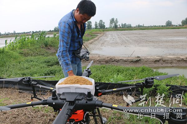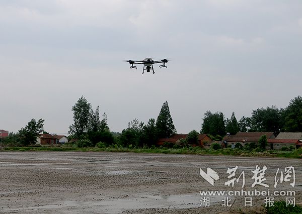 荆楚网客户端—荆楚网消息(记者李川 通讯员朱民、黄琪琪)6月17日下午5时,六合垸农场鸭子湖分场南台队农户张俊的水稻田里“呜呜”作响,一架翼展1.5米的无人机正在撒播水稻,不到2个小时28亩水稻田撒播完毕。