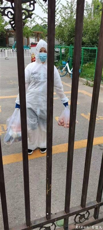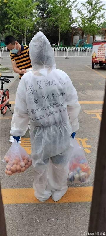 在网上流传的照片中,一位女士身穿戴帽子的白色防护服。在防护服的后面,用黑颜色笔写着:“我是湖北人,我为北京加油,感恩湖北疫情中全国人民。今天,该是我们报恩的时刻了!”在衣服的前面,则写着“砥砺前行”四个字。图片中,这名女子双手还拎着鸡蛋、蔬菜等物品。