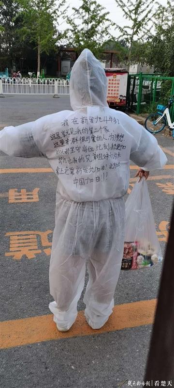 在杜先生提供的另外一张照片上,李女士的白色防护服背面写着:“我在新发地4年多了,这里是我的第二个家。这里有一群可爱的人,为了梦想365天都坚守岗位。此刻我要更加努力,让我的兄弟姐妹们快点儿拿上急需。新发地加油!北京加油!中国加油!”