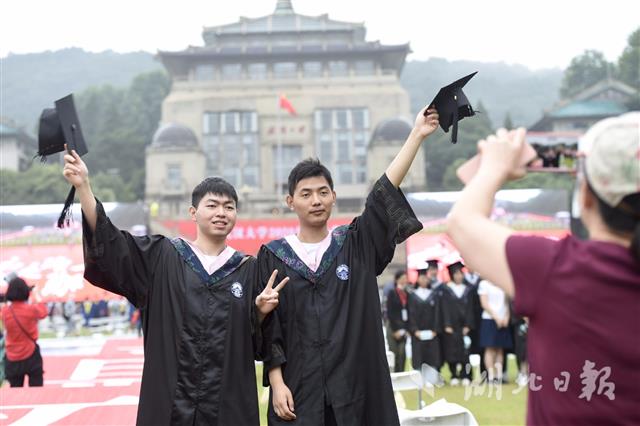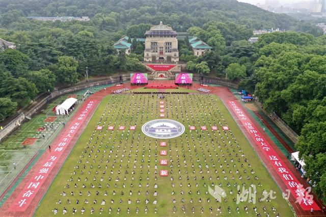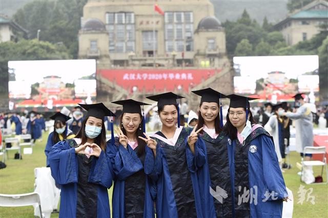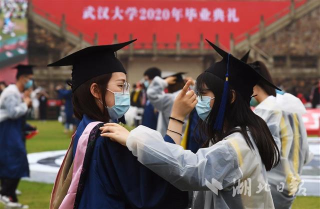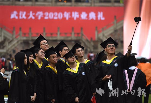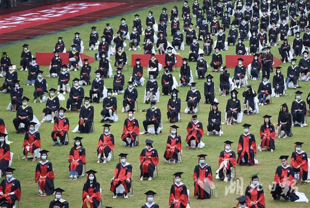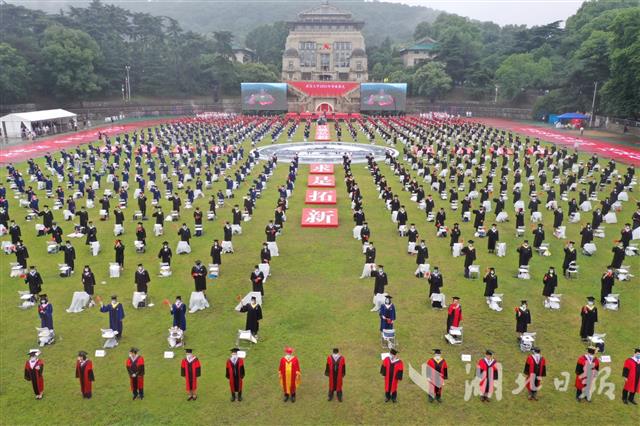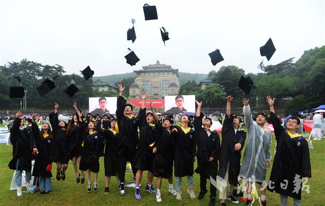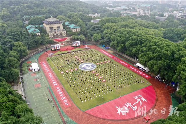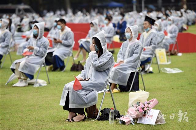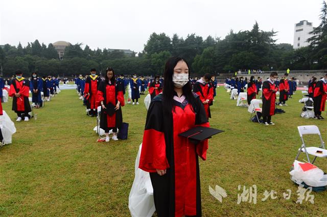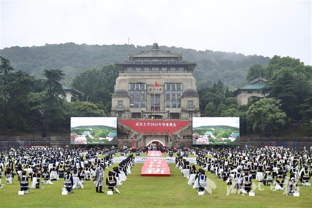 6月20日,武汉大学在雨中迎来2020年毕业典礼。为避免聚集,今年九一二操场现场只有660名毕业生代表。未能到场的毕业生则通过5G直播与大家“云”聚珞珈,他们可在未来三年内申请到校参加一次毕业典礼。(湖北日报全媒记者 田悦 李溪 通讯员 吴江龙 摄)