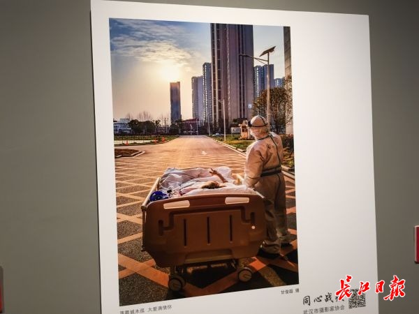 在一楼展厅,参观者首先看到的是“同心战疫——美术·书法·摄影主题作品展”,摄影、书法、美术作品各在一个展厅。在摄影作品展厅,疫情高峰期的一幕幕场景再现在参观者面前:医护人员抢救重症患者、雷神山火神山医院建设现场、社区工作人员为居民送菜、武汉关背后的“武汉加油”红色大字、方舱医院里轻症病人集体做体操……