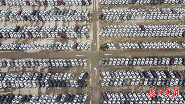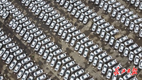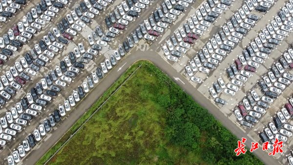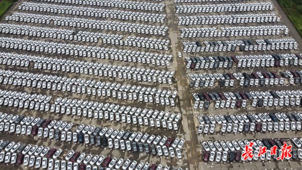 长江网6月23日讯6月23日,沌口东风大道附近一家车企停车场内密密麻麻停放了下线的新车,即将通过物流运往全国各地。(记者李子云 摄影报道)