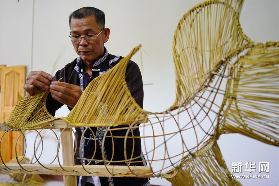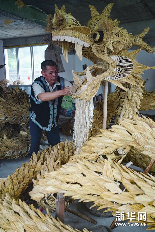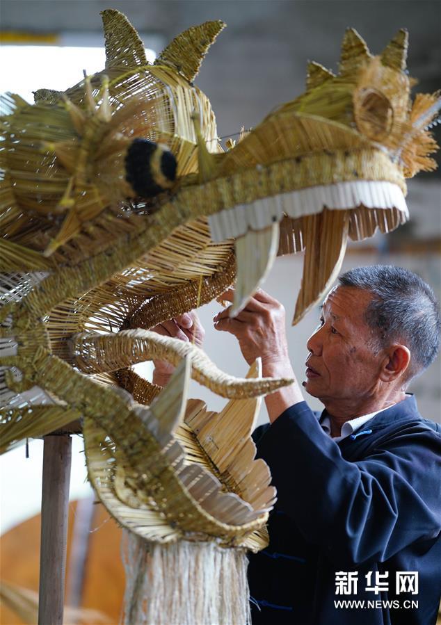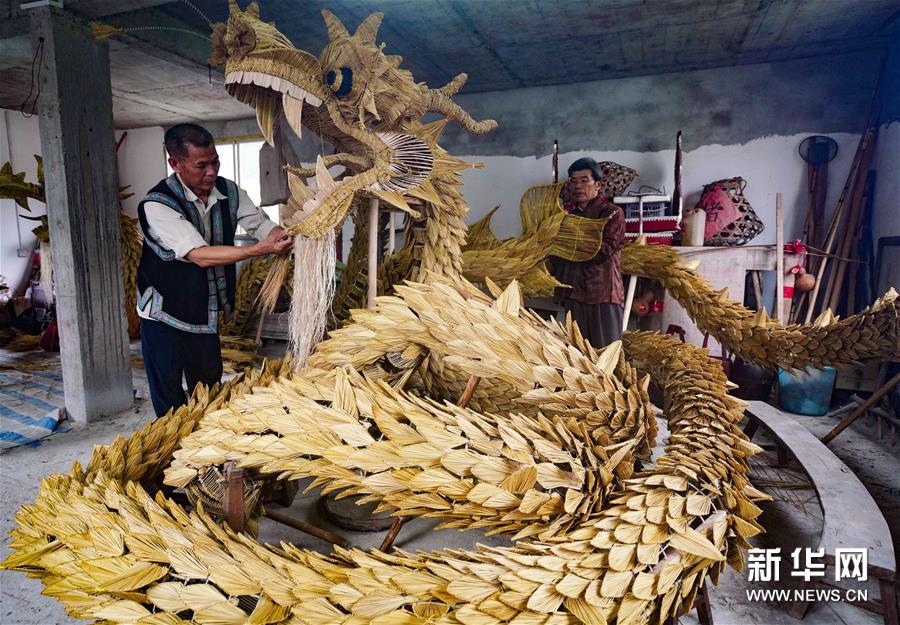 草龙以稻草为主要材料,辅以竹木做支架,采用编、插、嵌、剔、镂等十多种工艺,整条草龙用100多斤、数万根稻草编成,做工精细,惟妙惟肖。 新华社发(黄勇丹 摄)