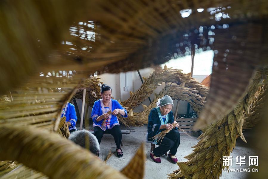 在广西龙胜各族自治县平等镇广南侗寨,村民在编织草龙(6月9日摄)。