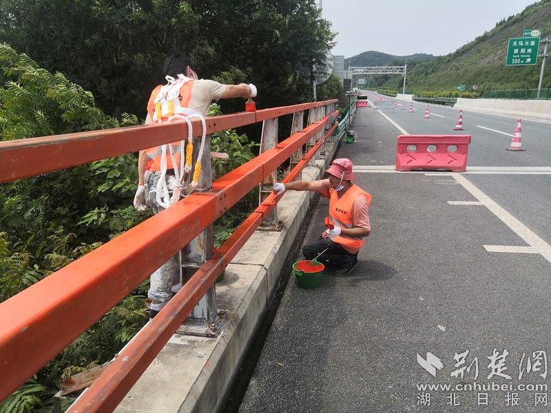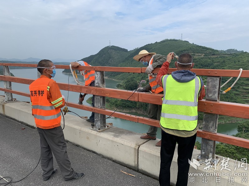 荆楚网客户端—荆楚网消息(通讯员 金伟忠 宫正)为了美化、净化路域行车环境,连日来,湖北交投鄂西北高速公路运营管理有限公司组织养护施工人员,对G59呼北高速郧(阳)十(堰)路段汉江大桥进行防腐涂装施工,及时给大桥护栏“换新衣”,为过往司乘营造“畅、安、舒、美”行车环境。