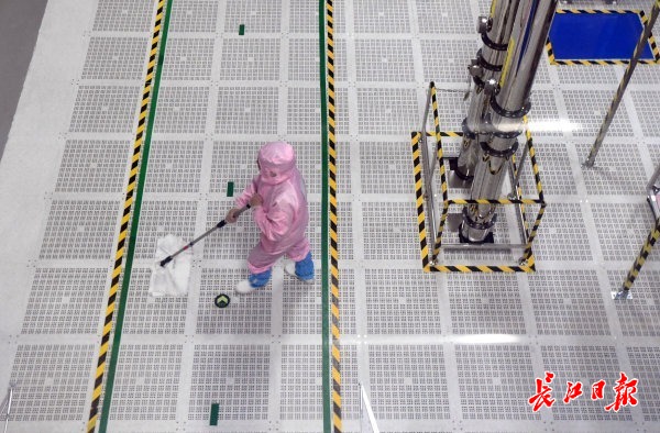 长江网6月24日讯 23日上午,长江网记者随武汉华星光电技术有限公司工作人员经过层层安全门安检走近t3项目生产线,在参观走廊,隔着防护玻璃俯瞰全自动化无尘车间,全球单体最大的LTPS(低温多晶硅)液晶显示面板生产线在“默默”地工作。车间里,几位穿着不同颜色防护服的工作人员,正在黄光区和白光区对设备进行日常的安检和地面保洁,他们除穿着防护服和专门鞋套外,还按无尘车间要求戴着口罩、手套和头盔等防护装备,维护着生产线的安全运转。记者高勇 摄影报道