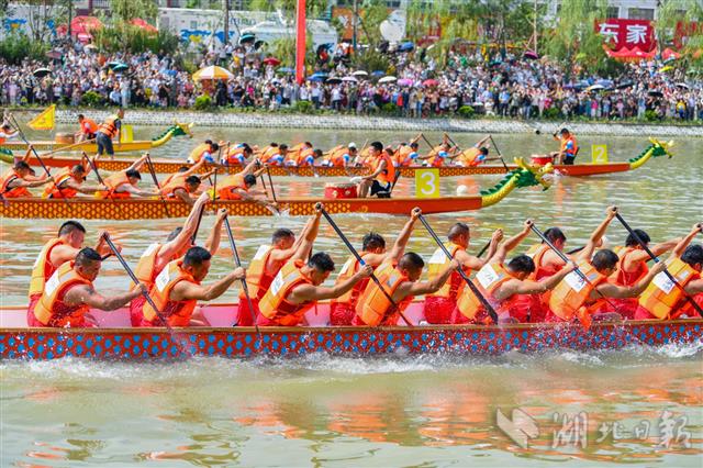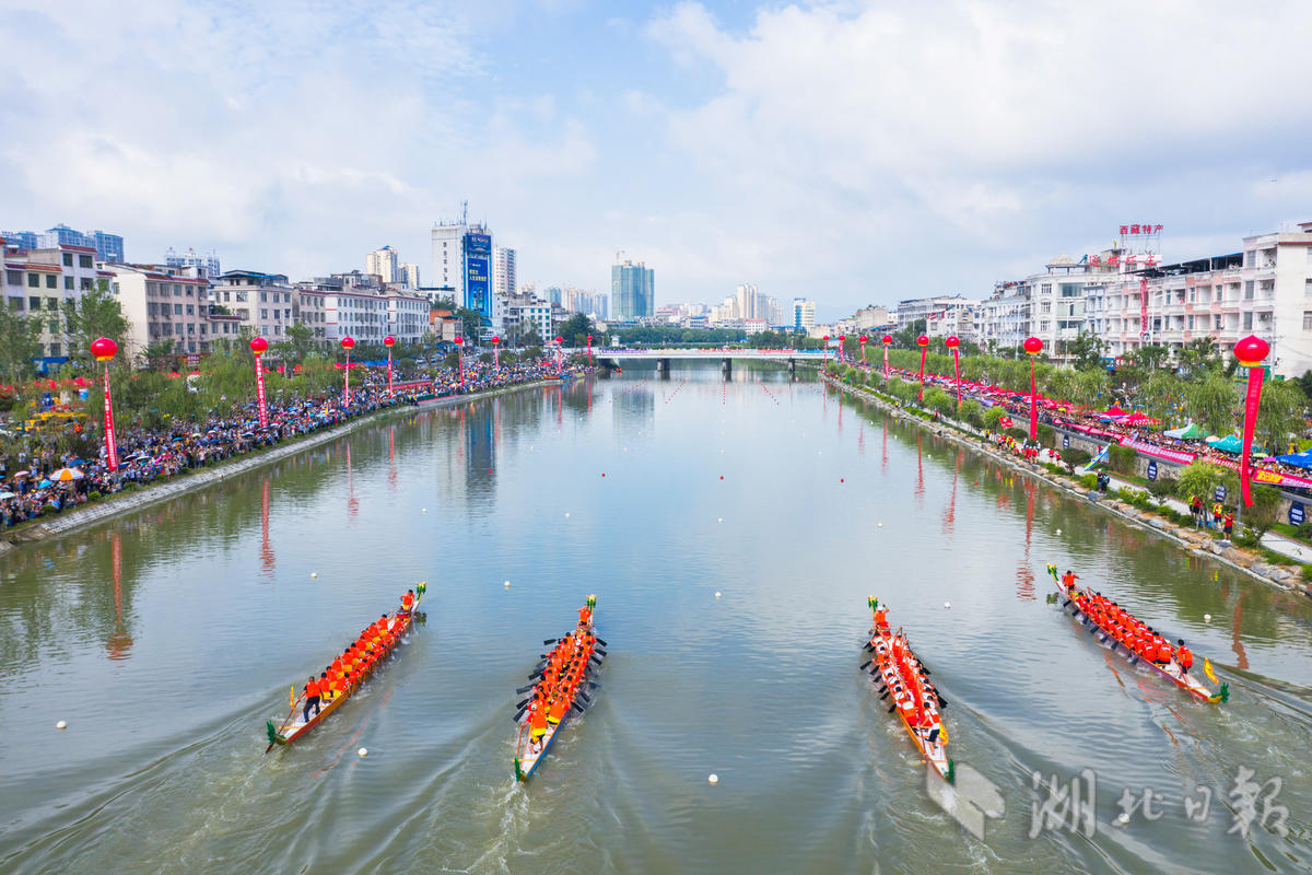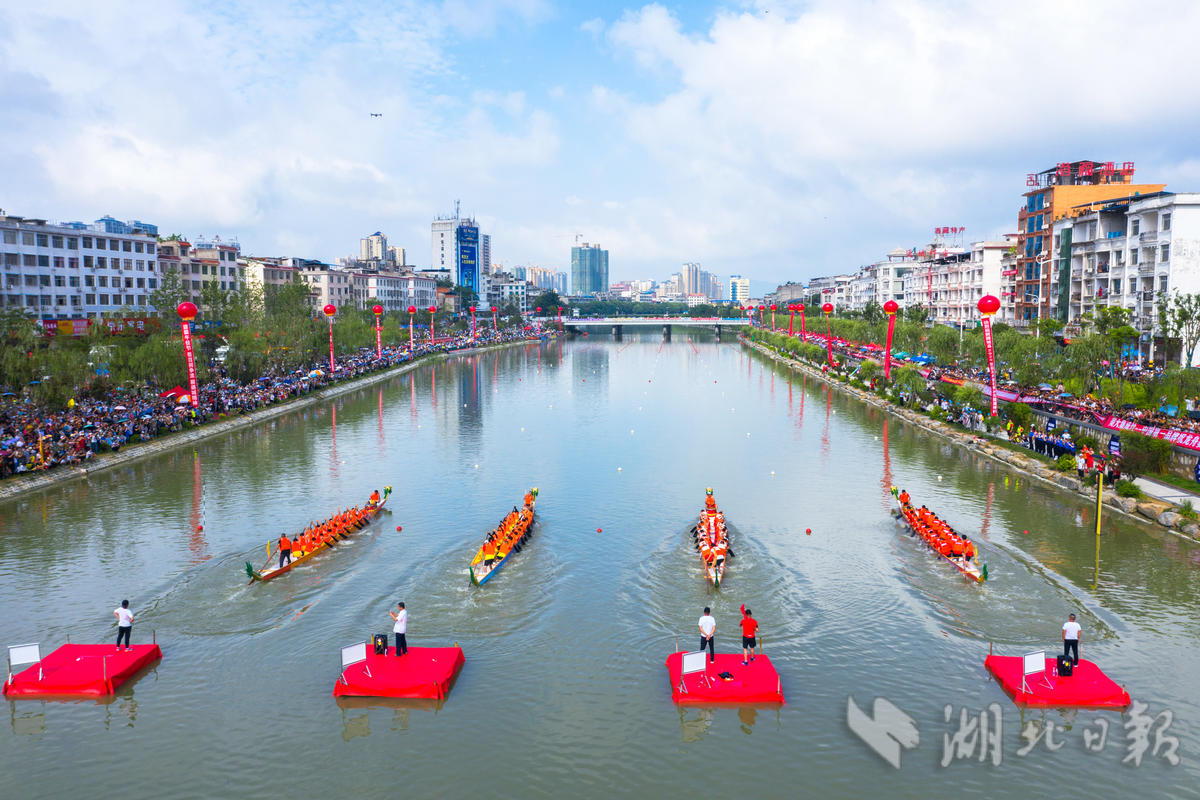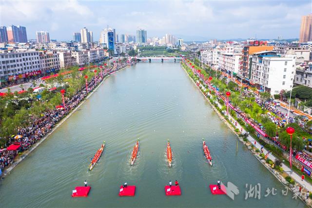 2020年6月25日,通城县在隽水河举办首届端午龙舟赛和消费扶贫产品赶集活动,主题为“迎端午佳节,看百舸争流,展通城精神”,赛场设置在县城隽水河雁塔桥至九眼桥之间,县内14支队伍参加角逐。赛事期间,该县在旭红路沿线举办农产品赶集活动,吸引市民消费扶贫。(湖北日报全媒记者 陈勇 通讯员 刘建平 摄)
