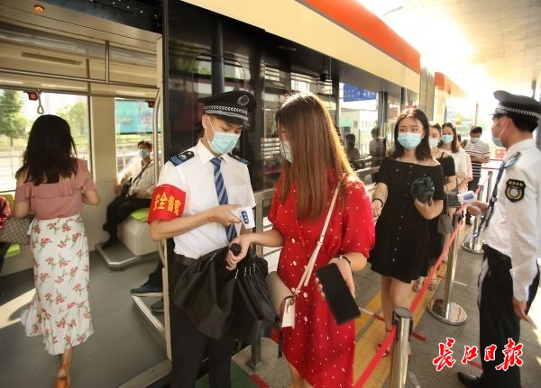 有轨电车车都T1线,乘客扫码后,测体温排队上车。记者张宁摄
