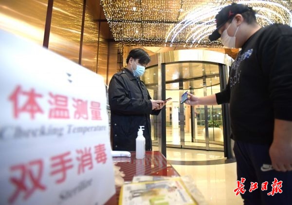 3月27日,武汉国际广场3月30日恢复营业,顾客在入口要经健康码扫码、测量体温、双手消毒后才能进入购物中心。记者刘斌 孙珺 摄