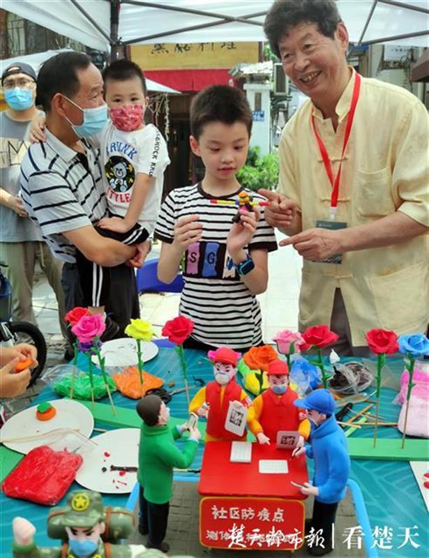 面塑非遗传人高志和,不仅展出自己创作的社区战疫佳作,还现场教小朋友学做面塑