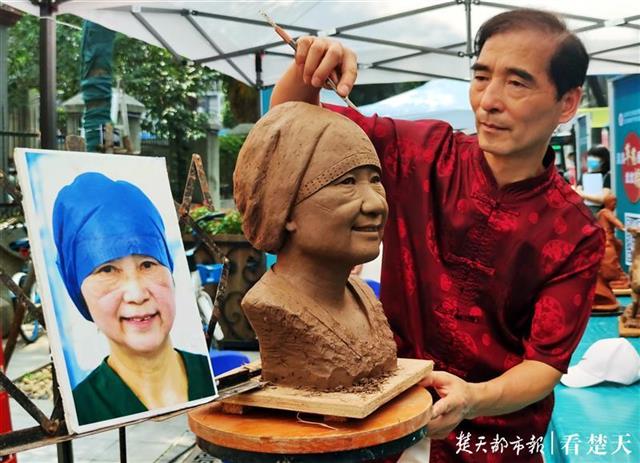 泥塑非遗传人胡作林,现场为李兰娟院士塑像