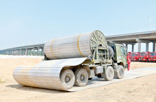 在训练现场,一辆近40吨的硬质机动路面车驶上动力舟桥,在水上驶向指定区域,冲锋舟编队跟进航行。同时,水陆两栖全地形车也深入水中进行人员转移训练。动力舟桥操作手岳斌介绍道:“舟桥宽8米,单舟长10米,从放舟、下水、拼接,可在8分钟内完成,能搭载大型抢险机械和人员,实现水上快速机动转移。”