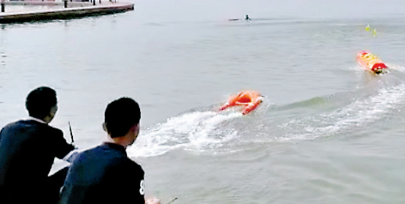 空中搜寻的无人机发现河流中有2名群众落水,现场指挥部调度武汉警备区携冲锋舟展开救援。一个外型像小艇的水上机器人在操作手指挥下,快速下水,仅用5分钟就将2名被困人员营救上岸。