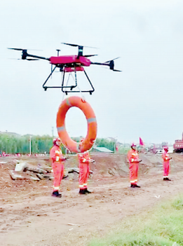 在综合演练中,另一个抢眼的设备是救援无人机,它不仅能通过航拍将抗洪现场的实况传送给地面接收站,帮助抢险人员更加科学、精准地抢险,而且通过操控,将救生圈等救援装备快速投给被困人员。