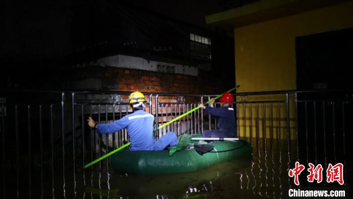 图为供电所员工划着橡皮艇在内涝小区抢修。 冯继开 摄