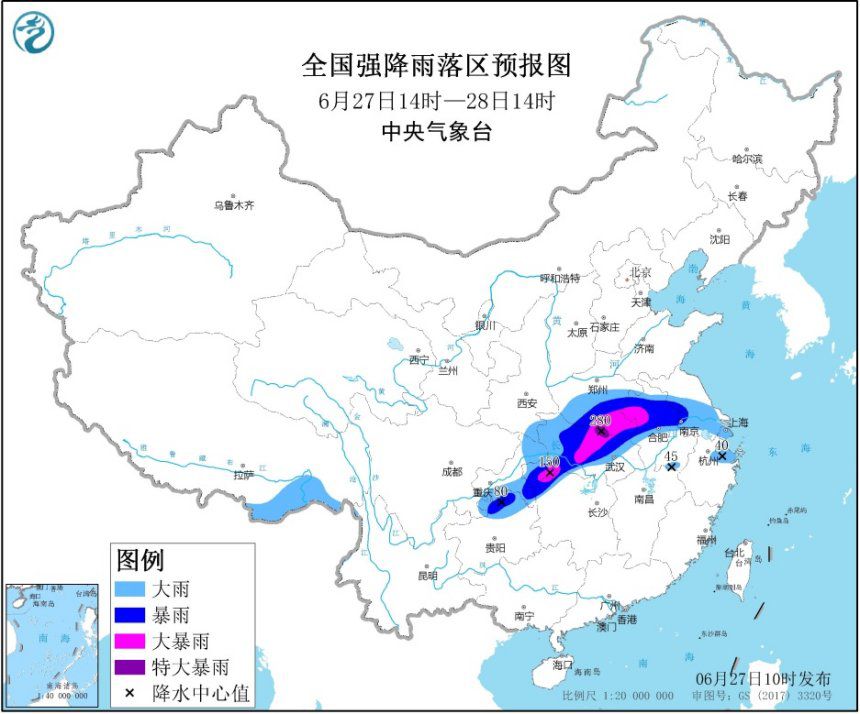 预计,6月27日14时至28日14时,重庆东部、贵州东北部、湖南西北部、湖北大部、河南中南部、安徽中北部、江苏中南部、上海等地有大到暴雨,其中,河南东南部、湖北中部和西南部、安徽西北部等地的部分地区有大暴雨,局地特大暴雨(250~280毫米)。上述部分地区伴有短时强降水(最大小时降雨量30~50毫米,局地可超过70毫米),局地有雷暴大风等强对流天气。